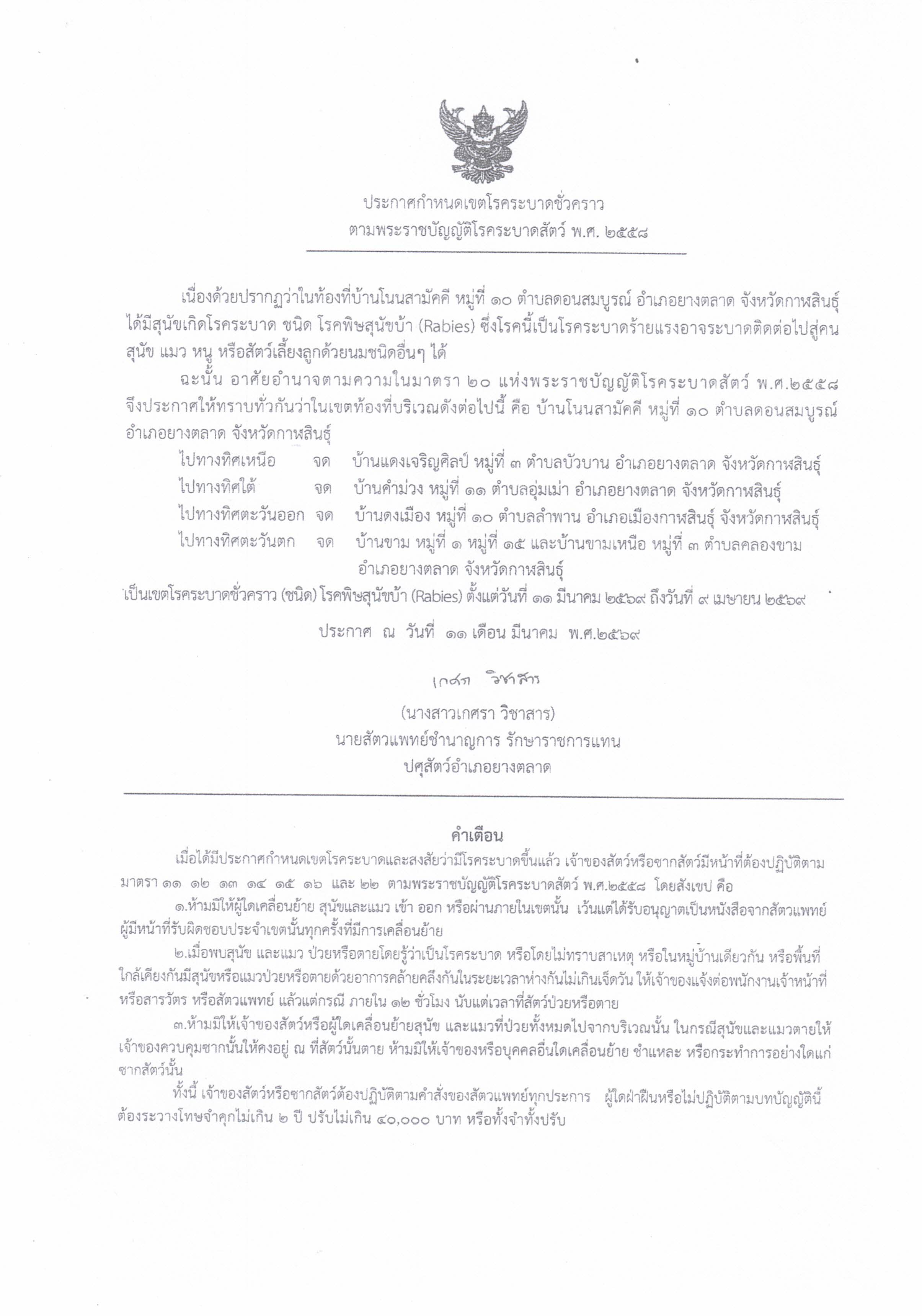 ประกาศกำหนดเขตโรคระบาดชั่วคราว ตามพระราชบัญญัติโรคระบาดสัตว์ พ.ศ. 2558 |